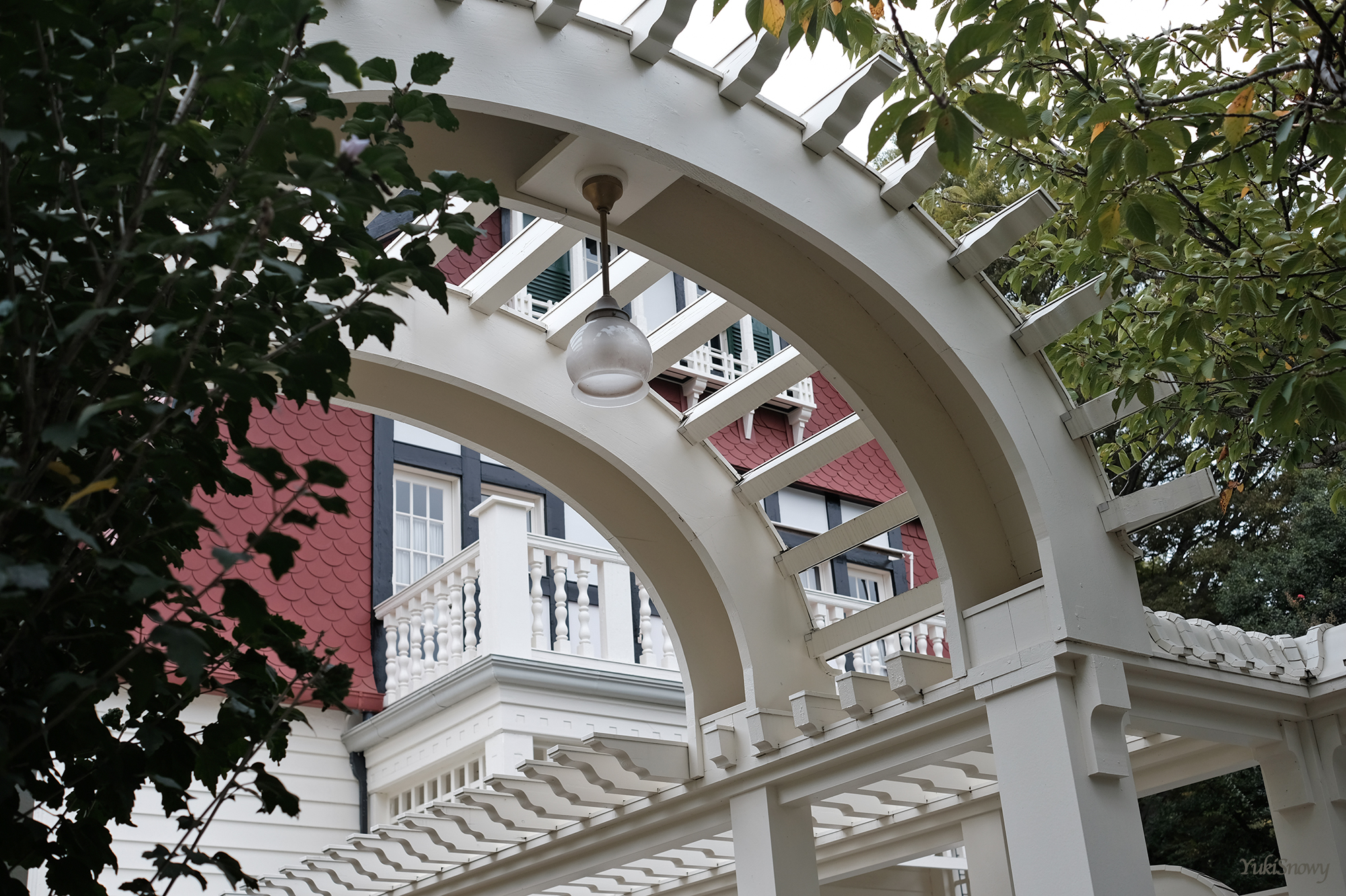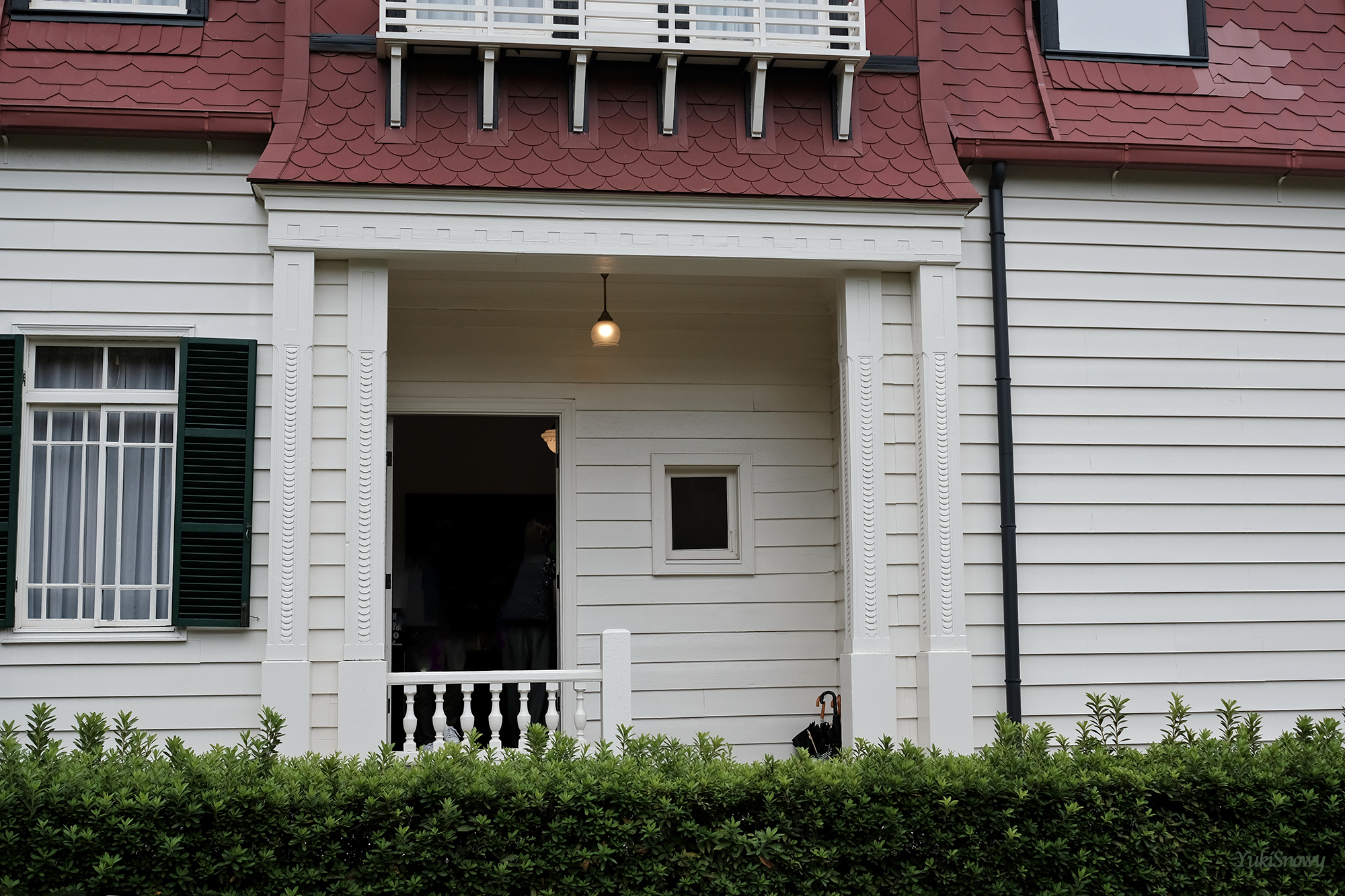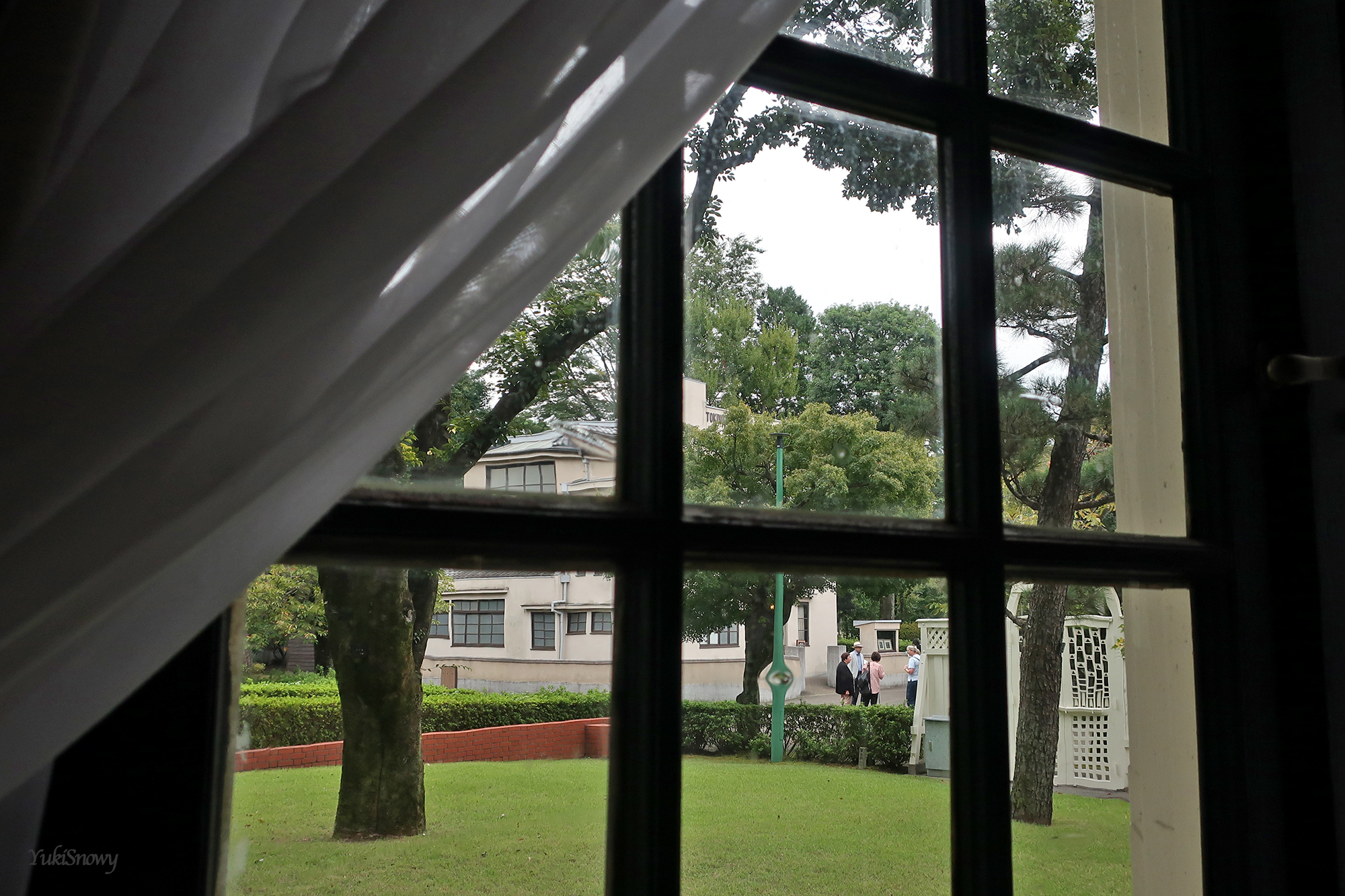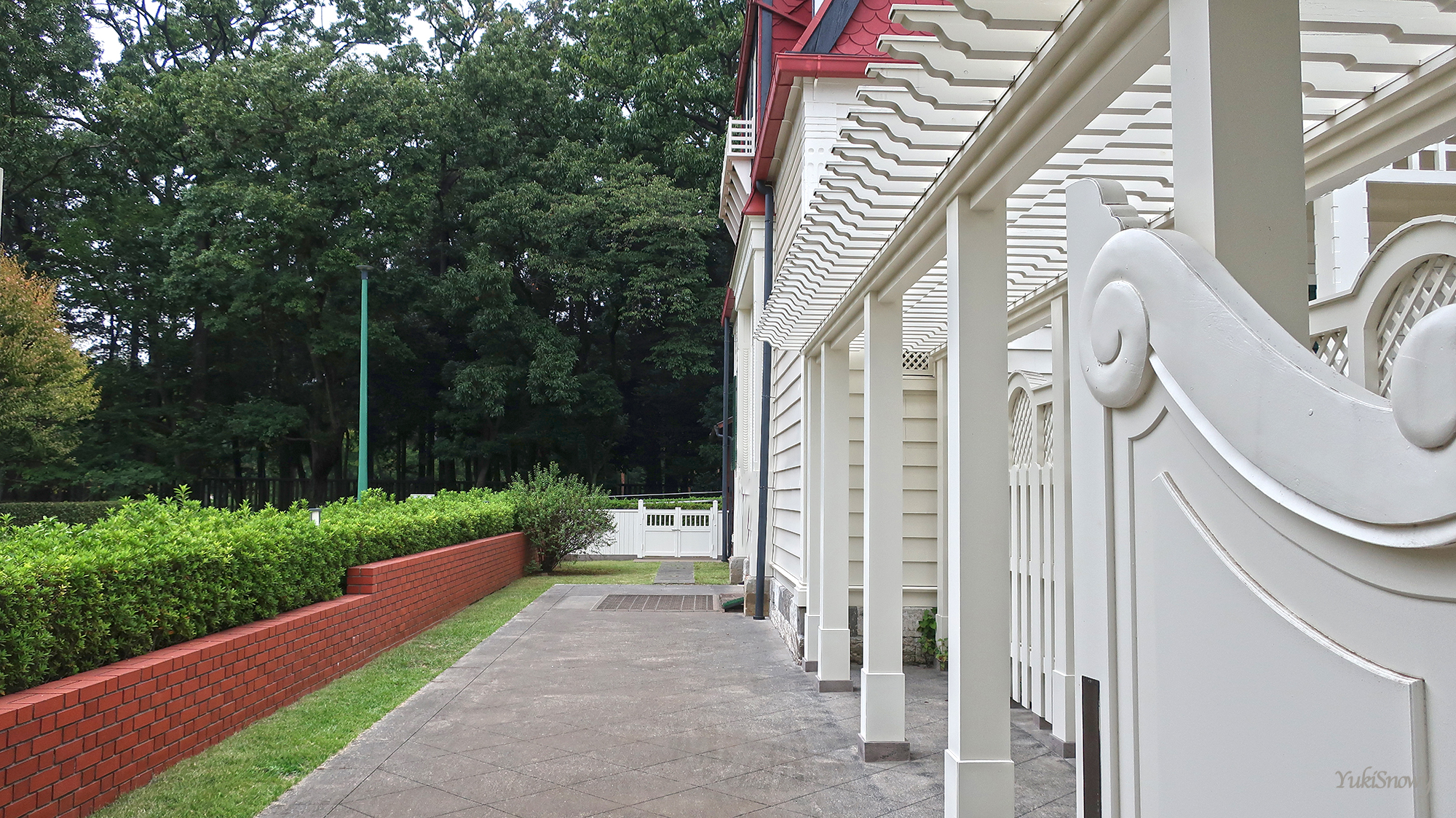 建物と一体感を出して作られている門や,門とエントランスについていた照明なども見応えがあった。この日はたまに雨がぱらつく曇り空だったが,おかげで緑が柔らかく,白い建物を引き立てていた。